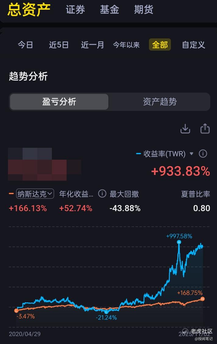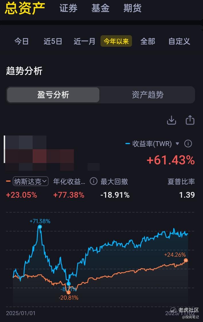 如上图所示,目前账户总收益来到了+933.83%,收益率相比上次小幅上升,上次是+899.29%,这是总的账户收益率,接下来看下今年以来的收益率,如下图所示,今年以来的收益率为+61.43%(上次是+56.04%),期间纳斯达克+23.05%,相对收益+38.38%。