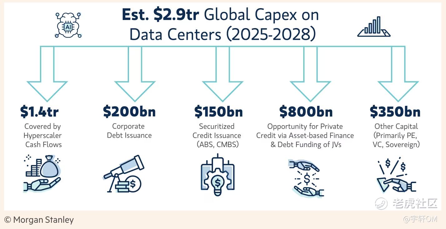 Morgan Stanley说,2025-2028年会有2.9万亿美元的资金,用于数据中心。其中将有1.3万亿美元用于土地、建筑和工程费用;剩余的1.6万亿美元,将用于从英伟达和其他公司购买GPU。