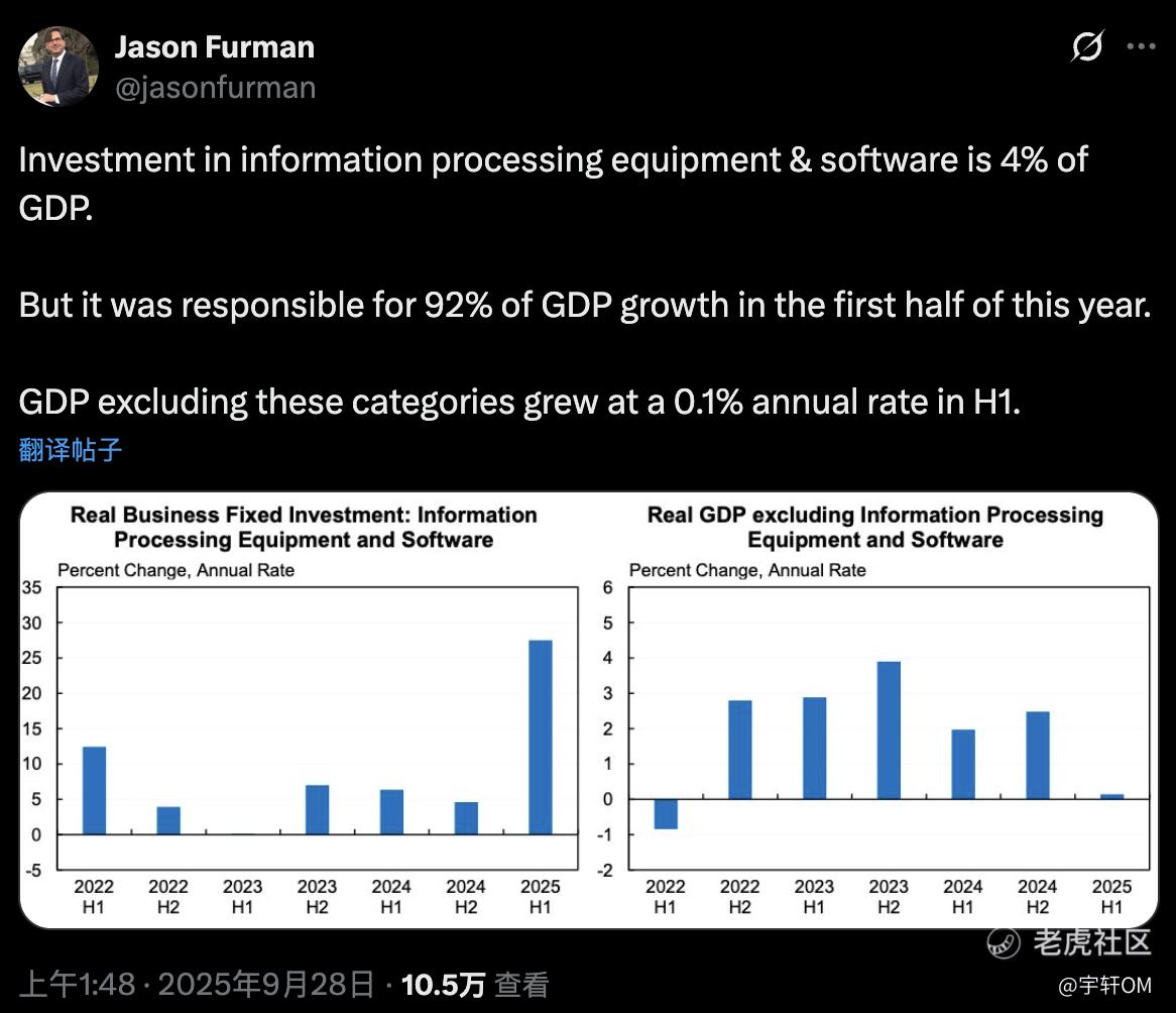 2025年的上半年,美国在“信息处理设备和软件”上的投资(你基本上可以把它等同于AI的资本支出),贡献了同期美国GDP增长的92%。