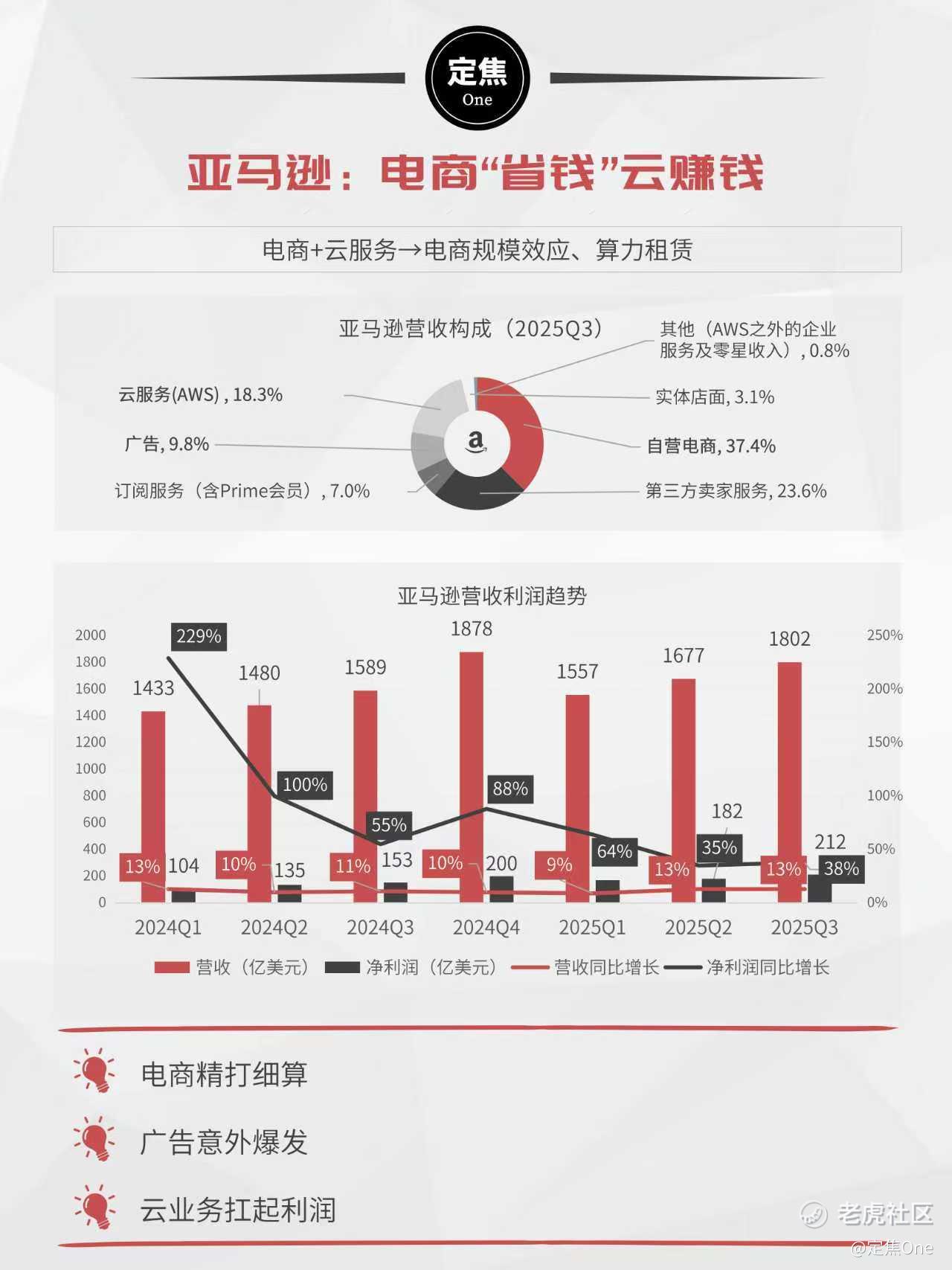 亚马逊一边在主业电商上“精打细算”,一边加码AWS云服务和AI,保证了净利润的高速增长。其核心战略是,让电商为AI“输血”,再由AI反哺电商和广告。