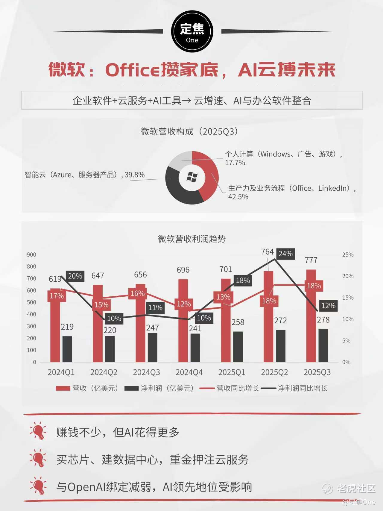 微软营收稳健增长,但净利润增速降至12%。钱主要投入到云业务,以及AI工具和Office的整合上。
