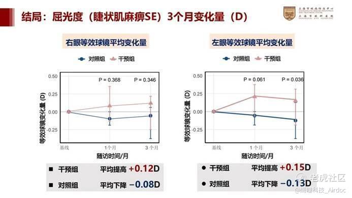 干预组屈光度3个月变化量为:右眼+0.12D,左眼+0.15D;对照组平均变化量为:右眼-0.08D,左眼-0.13D。