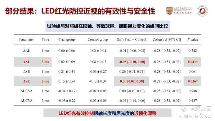 上海市眼病防治中心开展了一项单中心、随机对照的“LED红光控制近视进展”预实验,研究纳入40名8-12岁单纯性近视儿童,分为干预组和对照组,每组各20人。干预组接受鹰瞳PBM®视力康复仪照射(2次/日,3分钟/次),对照组采用极低剂量照射(0.001mW,模拟安慰剂)。