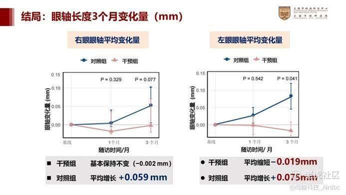 预实验研究数据显示,干预组3个月平均眼轴变化为:右眼-0.002mm,左眼-0.019mm;对照组眼轴变化为:右眼+0.059mm,左眼+0.075mm。