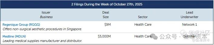 除 Boyd 外,另有两家公司提交了首次公开募股 (IPO) 申请。医疗产品供应商Medline ( MDLN ) 提交了 IPO 申请,预计融资额可达 50 亿美元。Medline 是一家大型医疗外科产品分销商和制造商,旗下两大业务板块供应约 33.5 万种产品:Medline 品牌,包括公司自有品牌和贴牌产品;以及供应链解决方案,负责分销第三方医疗用品,并为医疗机构提供物流和采购服务。总部位于新加坡的美容手术服务提供商 Regenique Group ( RGGG ) 提交了 IPO 申请,拟融资 900 万美元,市值达 1.67 亿美元。