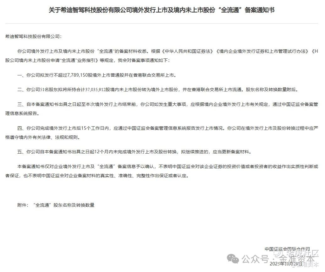 关于希迪智驾科技股份有限公司境外发行上市及境内未上市股份“全流通”备案通知书