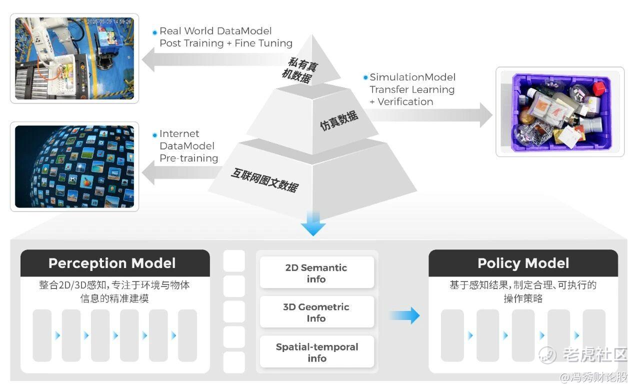 此次极智嘉新品无人拣选站则依靠具身智能模型基座Geek+ Brain与通用机械臂技术的实现了拣选环节的突破,Geek+ Brain基于海量行业数据训练生成,采用“感知-策略”两段式分层架构,可保证“数据到决策”路径的高效闭环与系统扩展性。Geek+ Brain在投入真实仓库使用前,已经过从互联网数据、仿真数据到真机数据的逐级多层次测试,在实际使用时可不断优化识别与抓取策略,实现AI模型在仓储环境中的持续进化,为仓库无人化提供底层技术支撑。