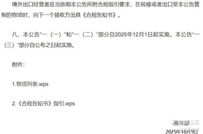 2025年10月9日,商务部发布了备受瞩目的61号公告,即开始对稀土外出口采取严格限制。其附件《物项列表》和《合规告知书指引》均采用.wps格式,并要求境外申请文件须以中文提交。