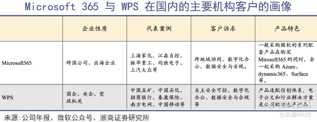 微软办公产品在国内的客户主要是跨国企业中国公司,或者具有出海需求的企业,主要诉求是实现海内外员工的跨地域协同;而金山办公聚焦政府机构、央国企,自主安全可控是客户的主要诉求。