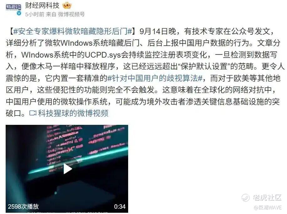 近些年来,诸如思科网络设备后门事件、SolarWinds Orion平台渗透等前车之鉴不远,微软虽声称“不创建后门”,但事实却并非如此。9月份就有技术专家质疑,微软UCPD驱动程序本意为“保护用户”,实则对中国软件“区别对待”,尤其针对360浏览器、WPS等竞品进行“监控”。