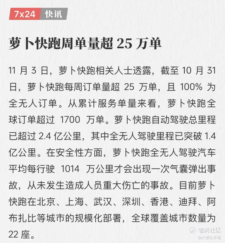 据萝卜快跑相关人士透露,截至10月31日,萝卜快跑每周订单量超25万单,且100%为全无人订单。从累计服务单量来看,萝卜快跑全球订单超过1700万单,远超谷歌Waymo的1000万单。