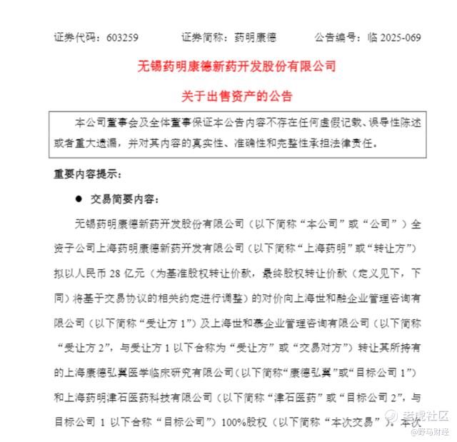 此外,药明康德也表示,经初步测算,本次交易最终实施完成产生的收益预计将超过公司最近一个会计年度经审计净利润的10%,预计将对公司2025年度净利润产生较大积极影响。