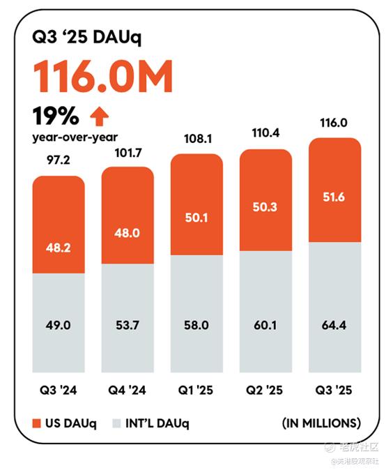 Reddit Q3财报中最积极的指标是其日活跃用户增长,尤其是美国本土用户的增长。今年Q2时,许多投资者曾担忧:Reddit美国日活跃用户数量环比几乎持平(为5030万,较Q1仅增加约20万),这一现象可能意味着其美国市场已接近饱和。当时市场还叠加了另一种担忧:ChatGPT引用自身内容的比例上升,导致美国搜索用户对Reddit的关注度下降。
