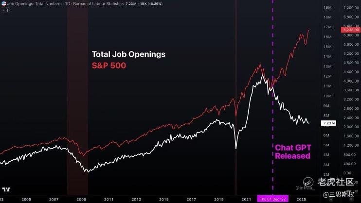 图:就业与标普500指数的巨大分叉,从前年AI行情刚启动时就已经开始