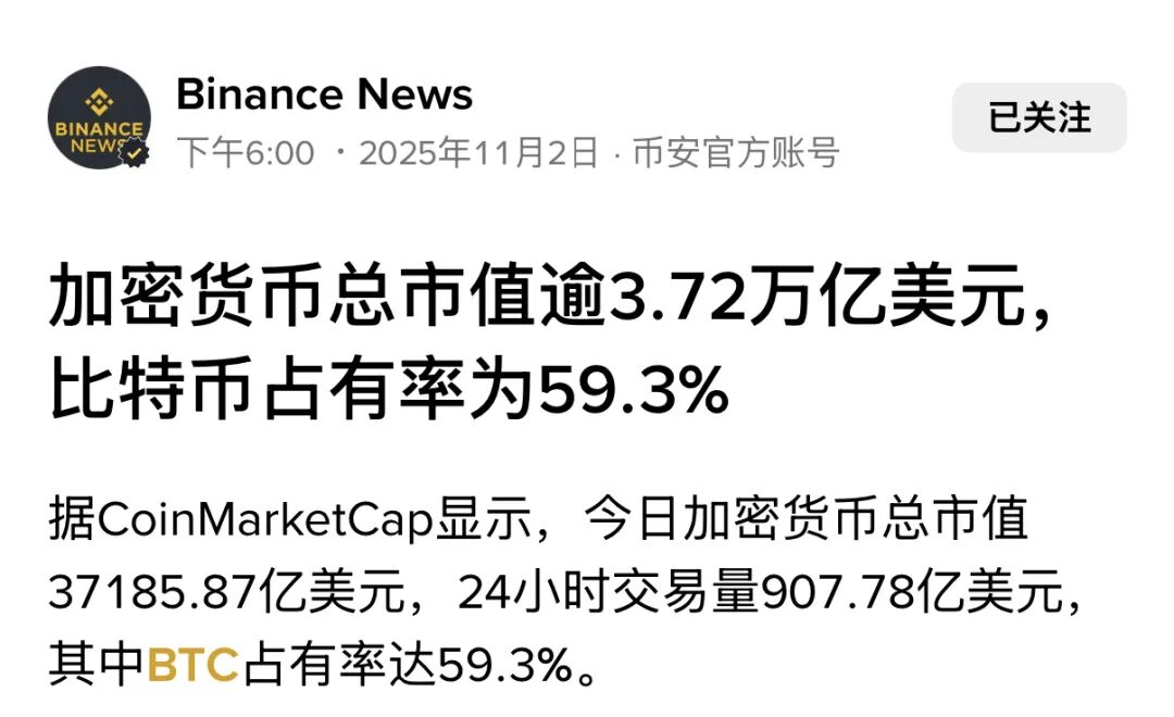 9. 加密货币总市值超过3.72万亿美元,比特币占比59.3%,凸显BTC主导地位仍稳固。