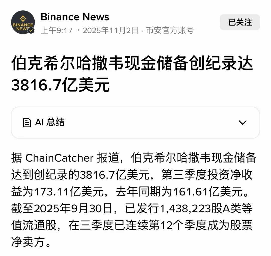 6. 伯克希尔哈撒韦现金储备创纪录达3816.7亿美元,连续12季度净卖股票,凸显市场避险情绪的潜在升温。