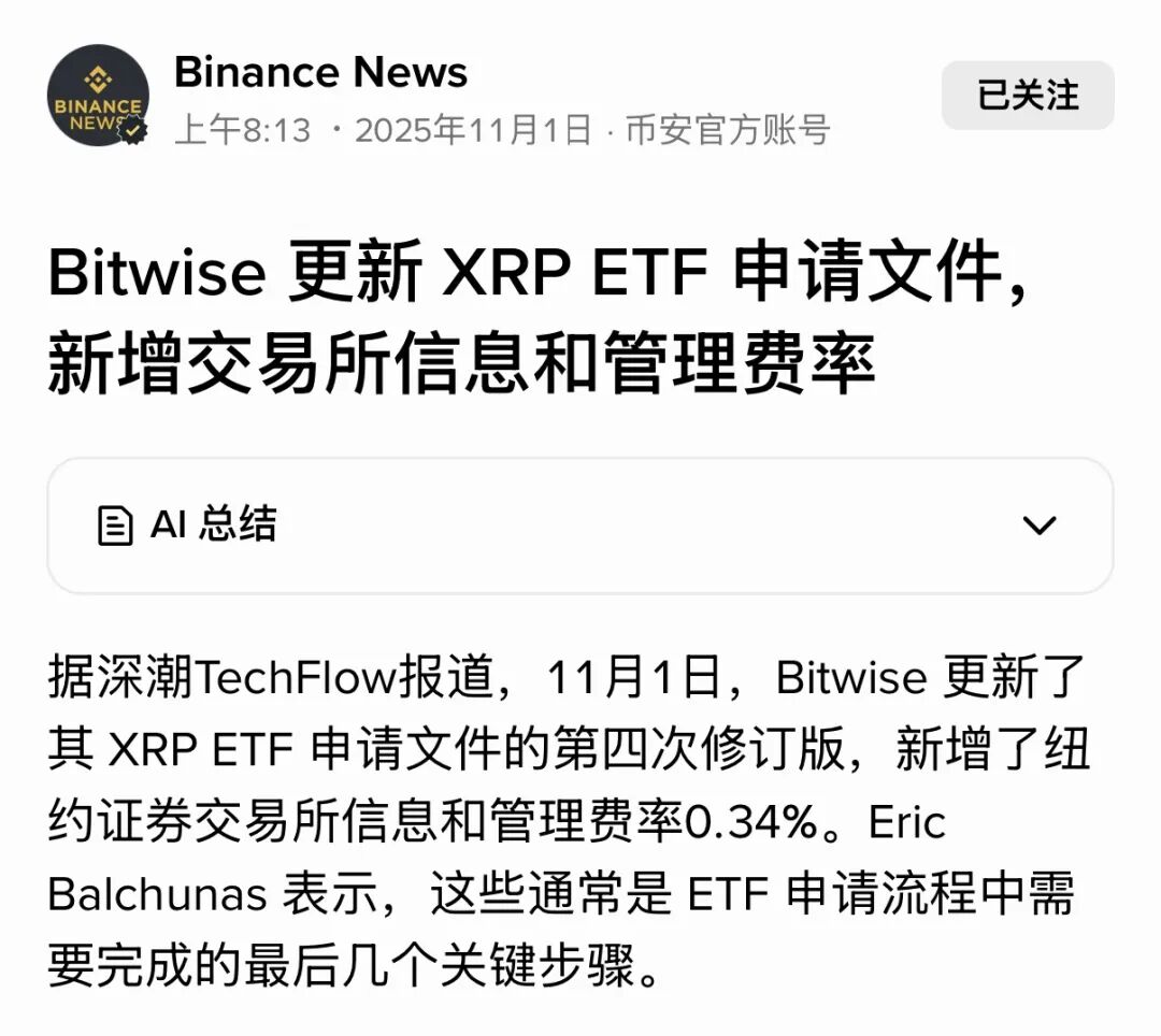 1. Bitwise再度更新XRP ETF文件,补充纽交所信息及0.34%管理费率,显示ETF审批已进入最终阶段。