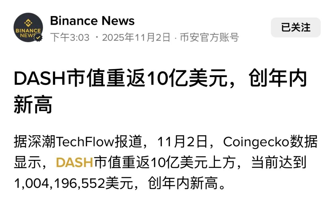 7. 隐私币DASH市值重返10亿美元以上,创年内新高,隐私保护需求重获市场关注。