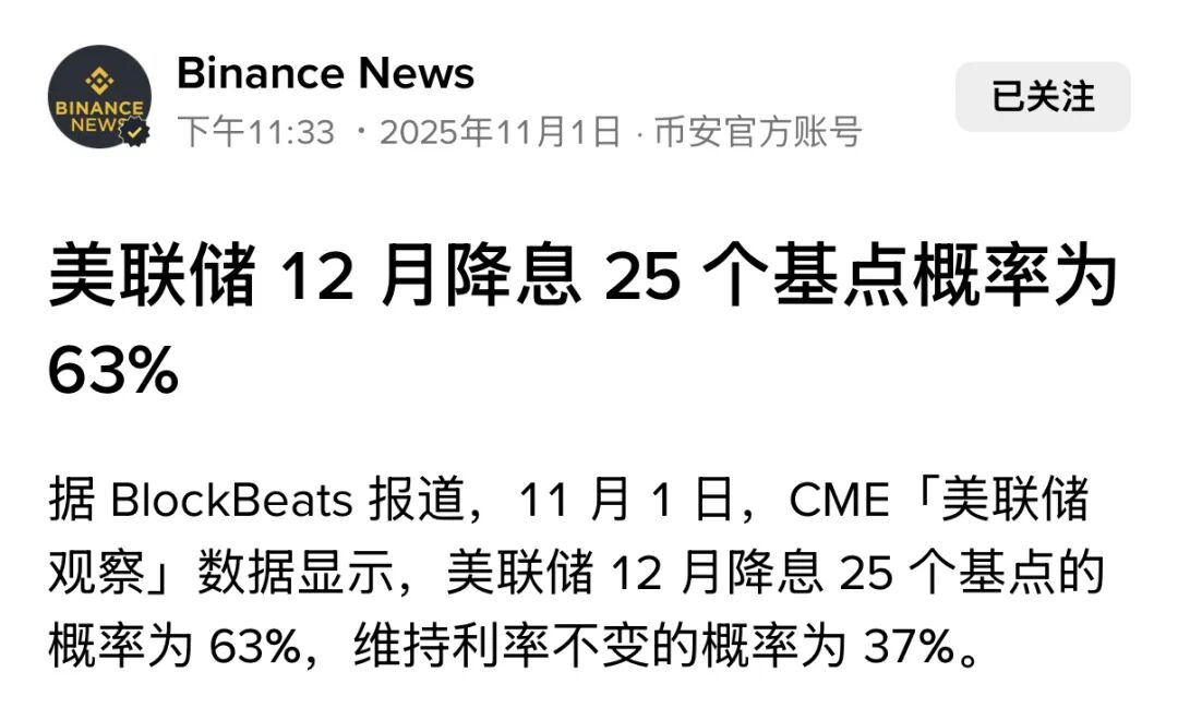 4. 美联储12月降息25个基点概率升至63%,保持不变概率为37%,预示市场对货币政策转折的期待持续升温。