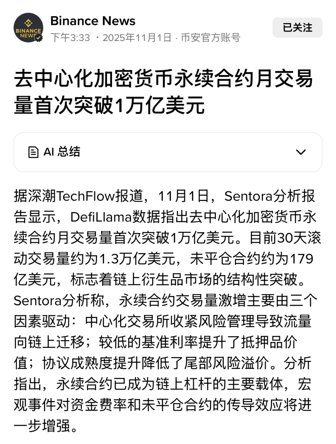 3. 去中心化加密货币永续合约月交易量首次突破万亿美元,其中30天滚动量1.3万亿美元,未平仓合约179亿美元,链上衍生品市场结构性跃升明显。