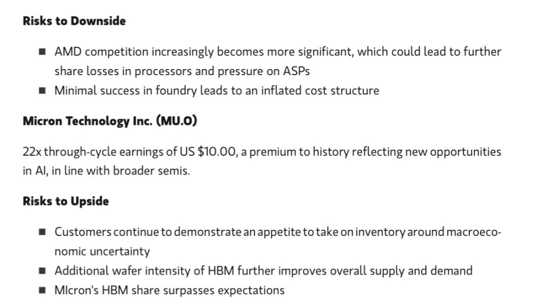 同时,Intel的代工野心也引发关注:未来虽然看似高溢价估值诱人,但若“foundry business fails to gain traction”(代工业务难以取得突破),成本将快速失控,竞争风险依然巨大。在存储领域,MU高带宽内存(HBM)市场份额增长惊艳,估值首次达到历史新高22倍EPS;SanDisk则凭借企业级SSD布局,EPS估值目标达12倍,尤其高带宽闪存(HBF)技术可能颠覆行业格局。更多细节潜力挖掘与风险评估,已上传。