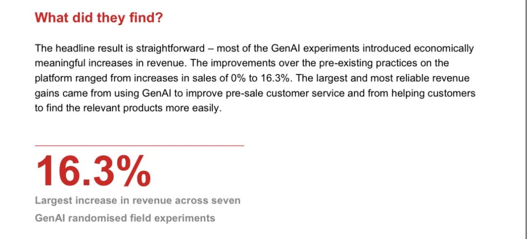 针对近期市场热议的“AI投资泡沫”问题,首次引用了真实企业环境下严格设计的随机对照实验数据,清晰证实了生成式AI(GenAI)在提升企业实际收入方面的直接作用。最令人瞩目的数据是:GenAI在真实商业场景实验中,实现了最高16.3%的收入增长。