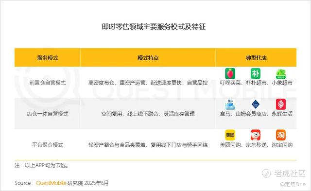 眼下,赛道分为三条路:以叮咚买菜、小象超市代表的前置仓自营模式;盒马、山姆会员店代表的店仓一体自营模式;以及美团闪购、京东秒送、淘宝闪购构成的平台聚合模式。后者正成为主战场,也是一切关于速度、规模的焦点所在,我们也将重点放在这一模式上。