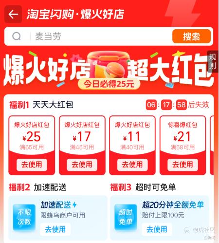 双11期间,淘宝闪购推出多项举措来对服务质量进行加码,用以提升闪购用户的消费体验。例如,在针对品质好店上线的“爆火好店”频道内,用户可以享受到加速配送、超时免单和25元大额红包三重福利。