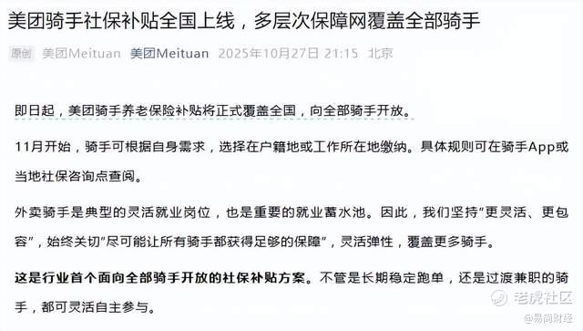 10月27日,不少骑手在送餐间隙刷起手机,才发现了美团官宣了件大事:骑手养老保险补贴正式覆盖全国,比原计划足足提前了两个月。