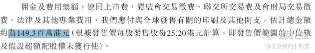 然后这个票招股书上按发售价范围的中位数25.20港元计算,公开的上市所有开支总额约为1.49亿港元,募资额约22.90亿港元,占比约6.52%,开支相比募资额算是比较少了。