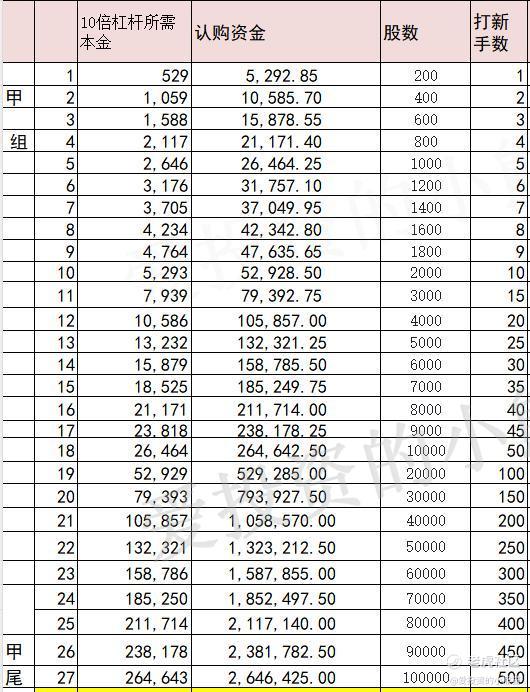 甲组的各档融资所需要的本金还有融资金额对应如下表: