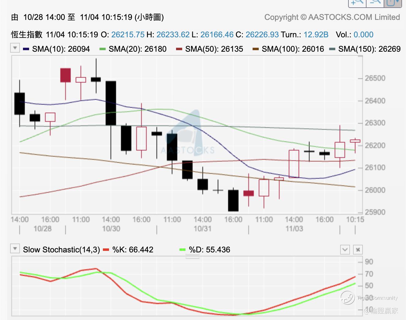 但尴尬啦,指数之后处于小时图嘅10/100线间,又大部份时间喺26000点上上落落,卡住呢啲关口位都系等方向再明显啲先至追啦。