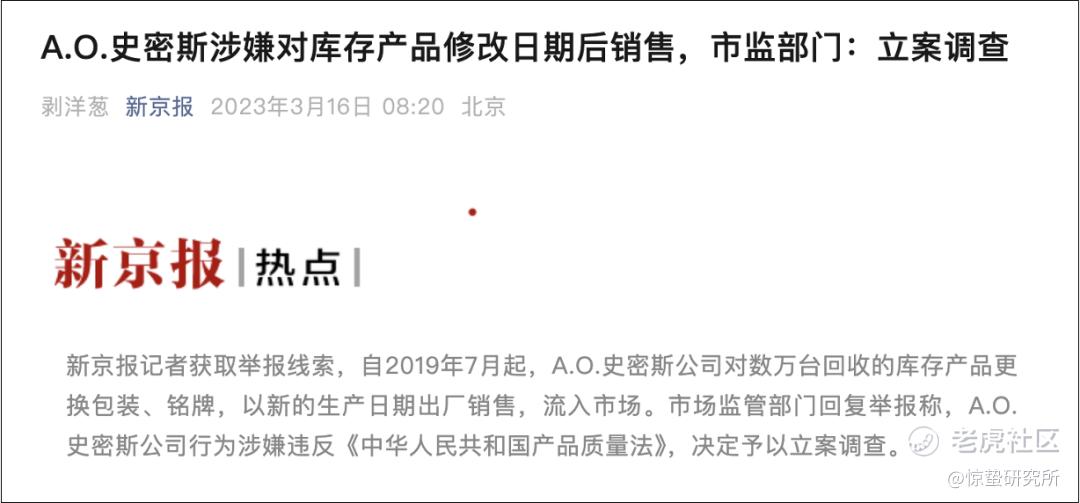 2023年新京报就曾报道,A.O.史密斯公司对回收的数万台库存产品更换包装、铭牌后,以新日期出厂销售,且未向消费者披露实情,这也是家电行业的普遍做法。