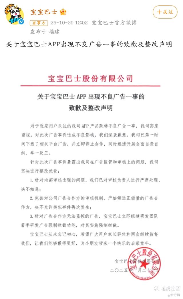 对此,10月29日,宝宝巴士在微博上发布致歉声明,称已严肃处理审核负责人,并承诺全面整改。