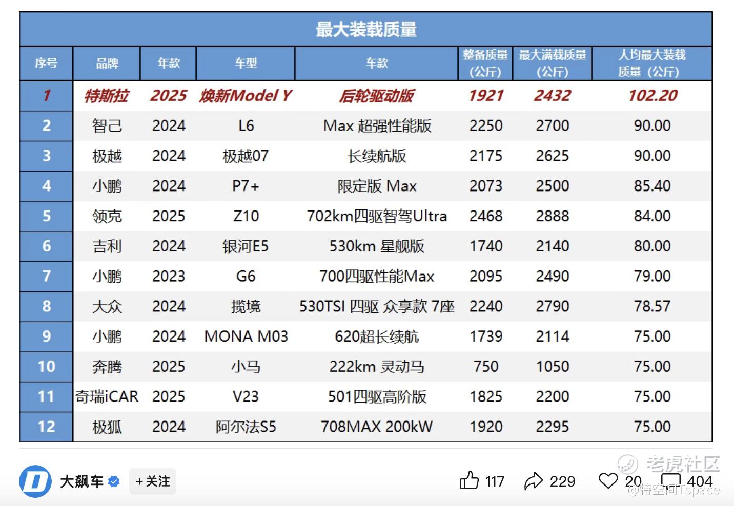 相比之下,特斯拉Model Y的人均最大承重质量达到了102.2公斤,远高于国家标准。