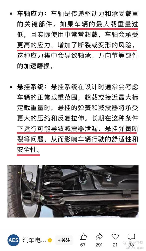 据行业博主科普,最大承载质量偏低的车,机械结构在超载时所承受的应力会显著增大,不仅会导致车轴变形、断裂,还可能引起减震器泄漏、悬挂弹簧疲劳断裂等问题,长期下来不仅影响行驶中的驾乘舒适性,还会引发更严重的安全问题。