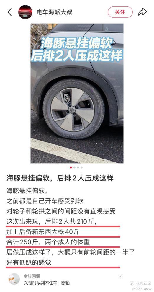 网友@电车海派大叔 的遭遇则更为大家敲响了安全警钟。一次出行时,后排坐了两个成人,又拉了些东西,总共也就250斤,可后轮的轮拱间隙却被严重压缩,他自嘲这点重量把车压出了低趴感。评论区的网友善意提醒,关键时刻刹不住车,还有可能断轴。