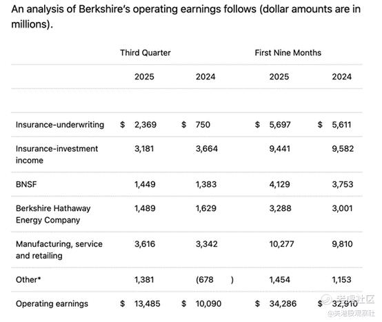 4. 制造及其他业务:伯克希尔的制造及其他业务在第三季度的盈利能力较去年同期大幅提升,主要原因是“其他”业务板块此前的亏损得以扭转。但需注意,这一增长对比存在一定失真——去年第三季度该板块的表现异常糟糕。从年初至今的数据来看,利润同样实现增长,但增幅较低,这一数据可能更能反映第四季度的增长趋势。
