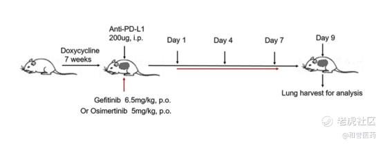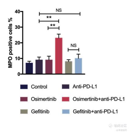 先看一个动物试验,MPO在中性粒细胞中大量表达,并在细胞活化时分泌,因此被视为炎症反应的重要标志物。我们这里按照下图所示的方式进行给药,我们可以看到下图的结果,在PD-1单抗联用奥希替尼的组中,MPO positive cell的比例显著高于其它组。奥希替尼单药治疗组相比,联合治疗组中促炎细胞因子(包括IFN-γ、IL-2、IL-5、TNF-α和IL-12p70)的水平也更高,这表明研究发现,联合疗法会促进炎症因子释放,加重正常肺组织损伤。但协同效应产生肺部炎症的机制仍不明确。