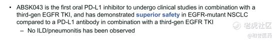 但是目前,和誉正在想办法突破这个遗憾!根据和誉研发PPT的介绍,PD-L1小分子抑制剂联用三代TKI的安全性要优于PD-L1抗体,且没有观察到间质性肺炎。