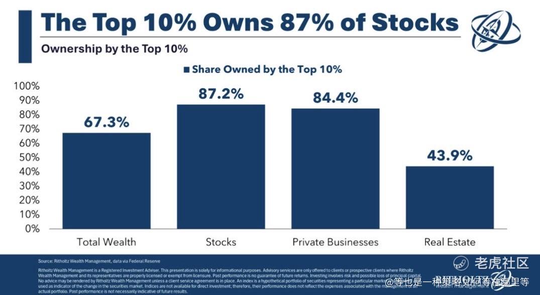 财富差距正在扩大:美国前10%的家庭,目前持有美国家庭所持有的全部股票的87%,其中前1%的家庭就持有50%。相比之下,其余90%的人只占13%,而最底层的50%的人只占1%。除此之外,排名前10%的人控制着84.4%的私营企业和43.9%的房地产。总体而言,最富有的10%的家庭,拥有全国67.3%的财富。财富差距从未如此之大。