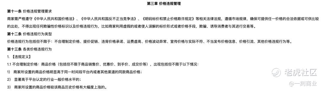 今年10月16日生效的《京东开放平台商品价格管理规则》中规定,商家在京东平台所售卖的商品价格不得高于同一时段其他渠道,否则属于违规。