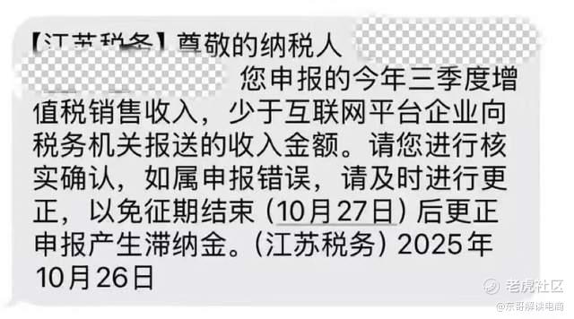 最近不少电商商家都收到了补缴税款的短信。短信内容大致是,“您申报的今年三季度增值税销售收入,少于互联网平台企业向税务机关报送的收入金额。请尽快核实。”