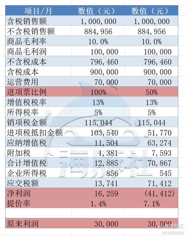 如果这家公司能找到所有采购商品对应的进项发票的话,自己的利润也将缩水近四成。由原来的3万变成1.6万元。要是保持原有的净利润水平,理论上需要提价1.4%。