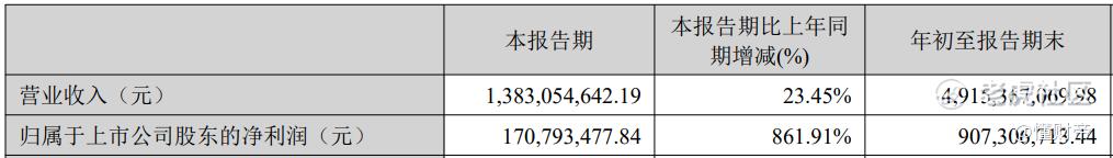 2025年第三季度,公司实现营业收入13.83亿元,同比增长23.45%;归属于上市公司股东的净利润同比增长861.91%,达到1.71亿元。