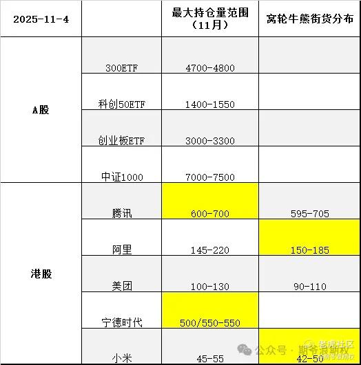 下图是今天大A的3个ETF和中证1000,以及港股的腾讯、阿里、美团、宁德和小米的最大持仓量范围以及窝轮牛熊分布范围,也就是11月的期权筹码分布,黄色的表示跟上个交易日有变动。