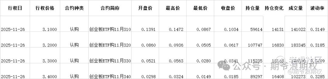 (3)创业板ETF期权:11月最大持仓范围3000-3300,今收3.112,下跌2.02%。期权11月主力合约,认购全部都是增仓,集中在3000-3700,合计8.2W张;认沽以增仓为主,集中2800-3200,合计3.4W张。市场看多的仓位仍然很进取,看空越来越悲观,喜忧参半。变化超过1W张的仓位如下: