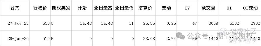 (4)宁德时代:11月最大持仓范围500/550-550,今收548.0,下跌1.26%。期权盘变化超过1000张的仓位如下,难得大户又有新动作,总的来说,不乐观也不悲观。
