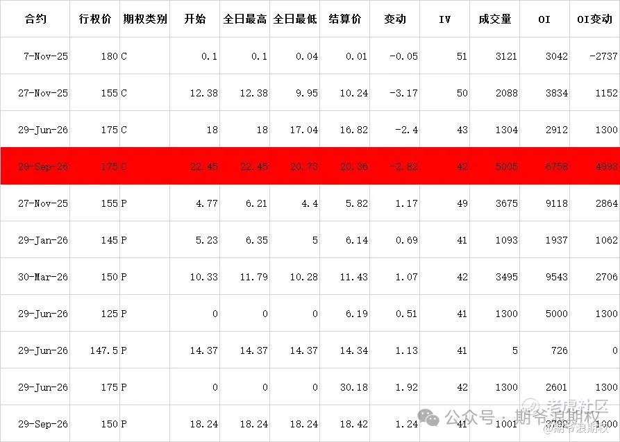 (2)阿里:11月最大持仓范围145-220,窝轮牛熊街货分布150-185,今收159.0,下跌2.57%。期权盘路变化超过1000张的仓位如下,红色是增仓较大的。总的来说,今天的大佬们防守大于进攻,更多的是担忧。
