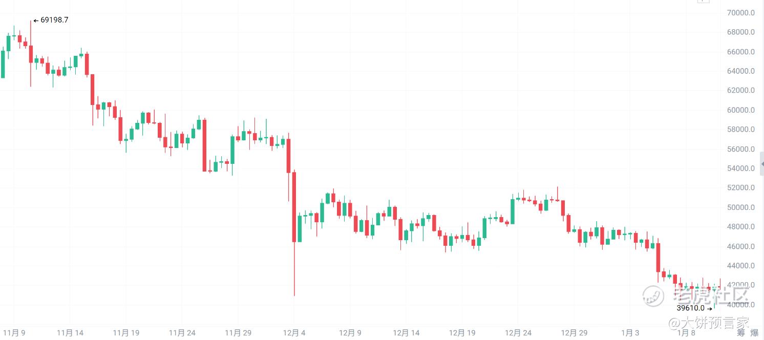 2021年12月4日,大饼发生了闪崩,单日跌幅达到14%,随后开始横盘震荡,一度回补前面的跌幅,但最终跌破4万美元关口,开启了2022年的熊市。